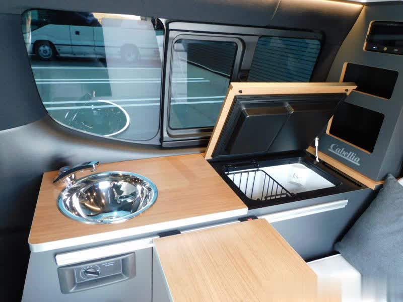 厨房区域设施也不少,内侧的橱柜台面不小万通配资,做饭使用便携式卡式炉,上部配有翻盖式50升车载冰箱,不锈钢洗菜盆和水龙头,水箱不大只有15升。