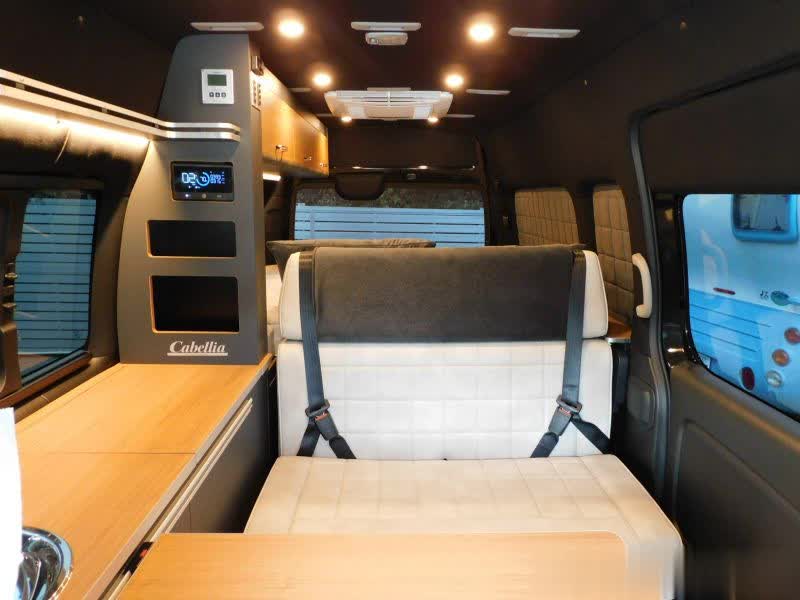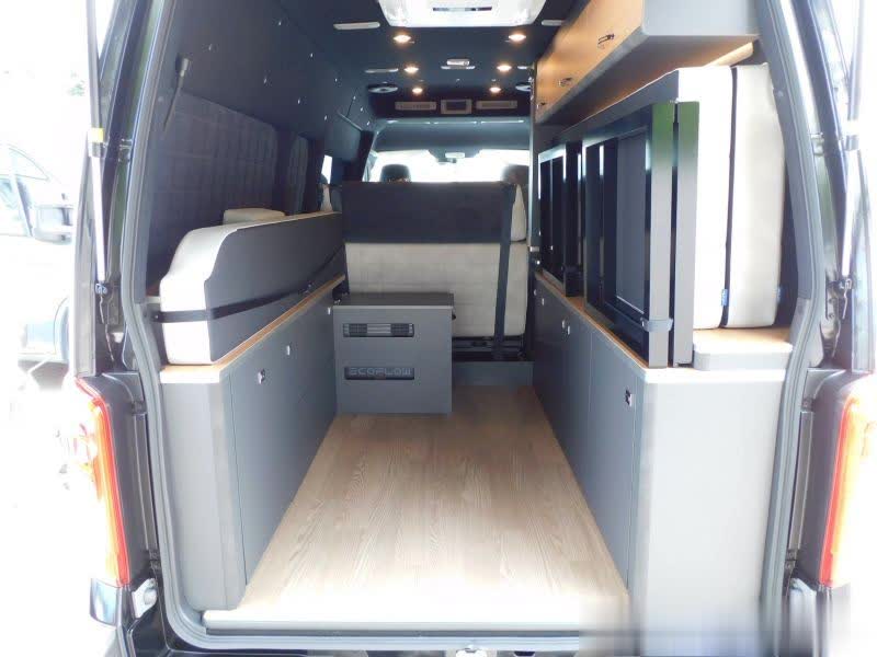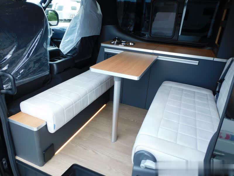 来到车内,前部是一个联排座椅,驾驶室座椅背后是一组长条沙发座,正好和后部座椅形成会客区,搭上一张桌板,可以吃饭聊天,座椅内侧是厨房区域,车内后部空间很大,前后通透,能放下摩托车。车顶设置有顶置空调。