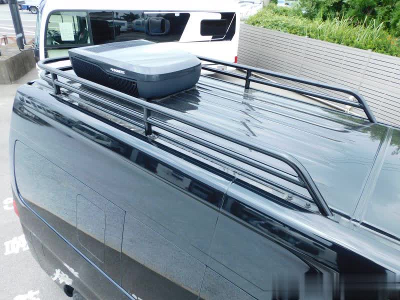 整车尺寸,长度:5080mm万通配资,宽度:1690mm,高度:2470mm,车身为黑色涂装。中门为单侧滑门,右侧没有车门,封闭状态,尾门为后翻盖式开启。车顶是一台顶置空调外机,周边安装了侧栏,当行李架使用,放置大件物品。