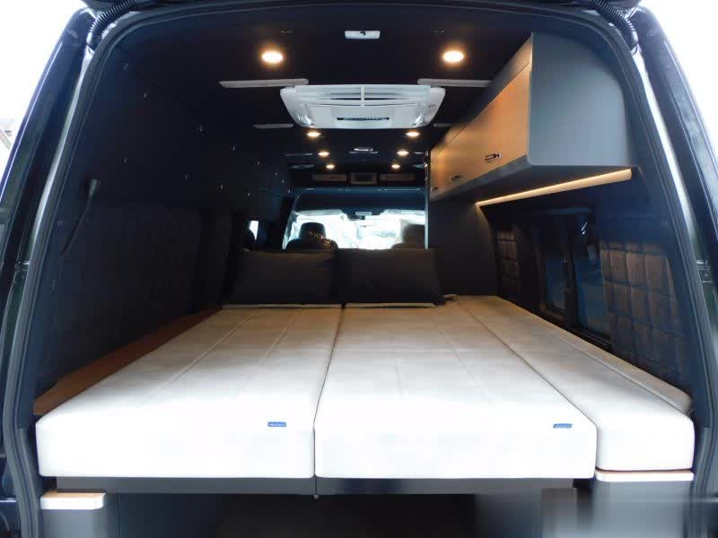 在晚上休息时,前部座椅可以翻折放倒,桌板放平,和前部沙发拼成一张单人床,尺寸为18090公分,后部床板放倒,也是一张床位,尺寸达到1.51.9米,可以睡下两人。